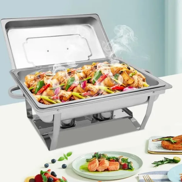 Elegant chafing dish-buffetsæt i sortDette sæt i rustfrit stål holder maden jævnt varm og giver bordet et stilrent udtryk. Den sorte finish passer til familiearrangementer, banketter og hverdagsservering, hvor både funktion og æstetik er vigtige.