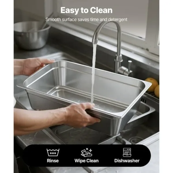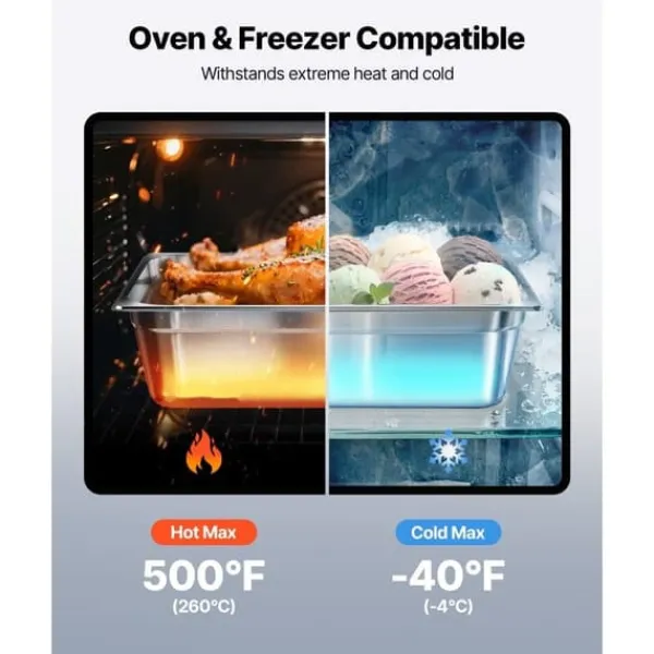 Rustfrit stål i kommerciel kvalitet: Vores hotelpande i rustfrit stål af 22-gauge SS201 rustfrit stål er skabt til langvarig holdbarhed og fremragende rustbestandighed. Ideel til både varme og kolde fødevarer og tåler temperaturer fra -40℉ til 500℉ (-4℃ til 260℃). Velegnet til kommercielle opvaskemaskiner, køleskabe, frysere og mere, der tåler høje temperaturer.