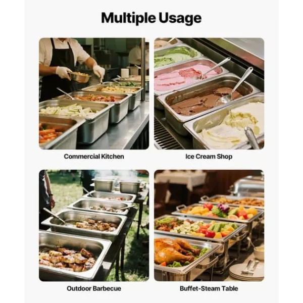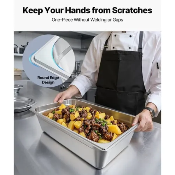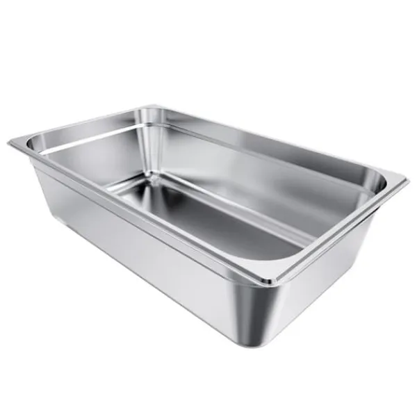 Rustfrit stål i kommerciel kvalitet: Vores hotelpande i rustfrit stål er lavet af 22-gauge SS201 rustfrit stål, der sikrer langvarig holdbarhed og enestående rustbestandighed. Dette gør den ideel til diverse madvarer og sikrer, at den kan anvendes i køleskabe, frysere og opvaskemaskiner, der kræver høje temperaturer.