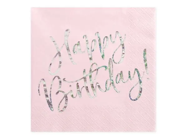 Papirservietter i lys pudderrosa med holografisk indskrift “Happy Birthday”, mål udfoldet ca. 33 x 33 cm, mål foldet ca. 16,5 x 16,5 cm.