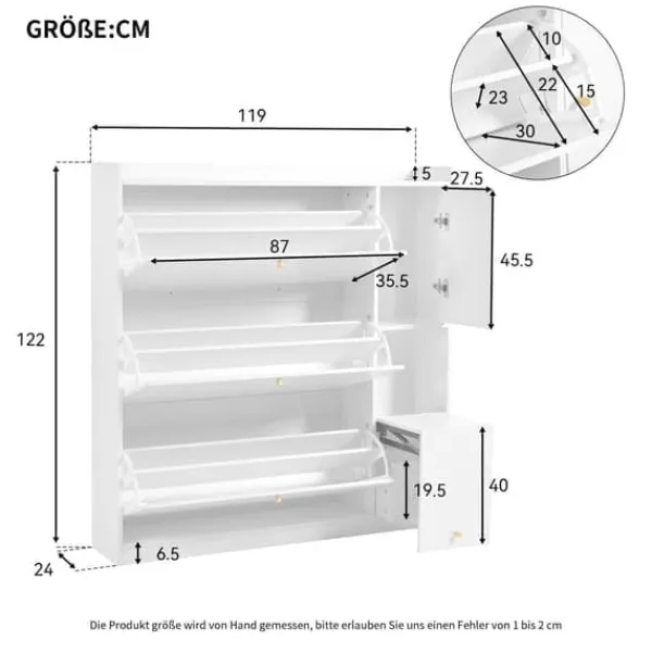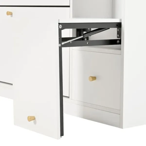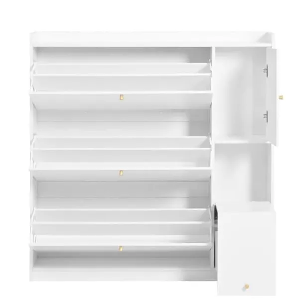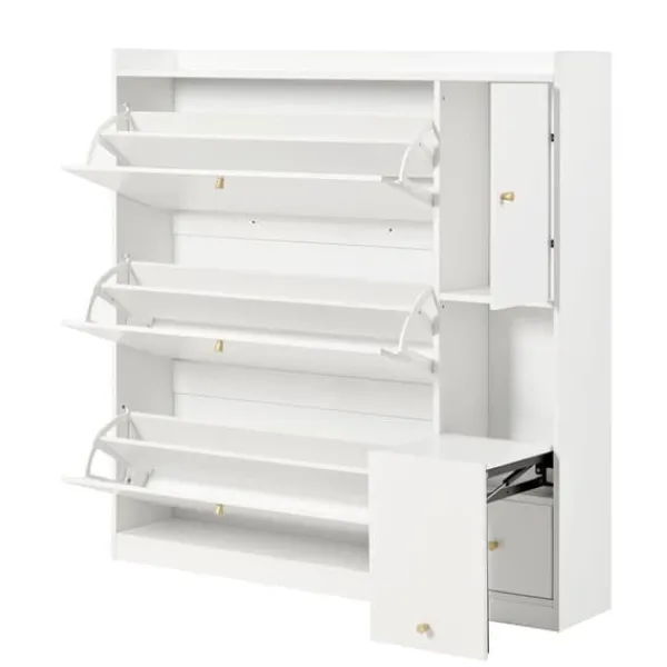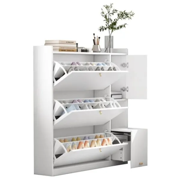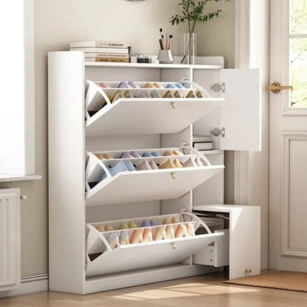 Dette skab tilbyder fremragende opbevaringsplads med tre skrå skuffer og justerbare hylder til at rumme sko i forskellige størrelser.
