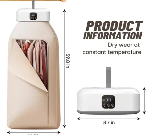 Denne bærbare tørretumbler er designet til at passe perfekt i små rum såsom lejligheder, campingvogne eller på farten. Takket være det foldbare design kan du nemt opbevare det, når det ikke er i brug, hvilket gør det meget praktisk til trange steder. Fjernbetjeningen giver dig mulighed for problemfrit at starte, stoppe og justere indstillinger uden at skulle røre ved maskinen.