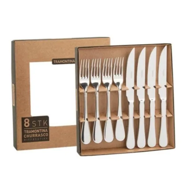Tramontina Grill cutlery Glossy, 8-pack. Strong steak cutlery of top quality steel. The knife is 24 cm and made of 13/0 steel and the fork is 20 cm long and made of 18/0 steel. Can be cleaned in a dishwasher.