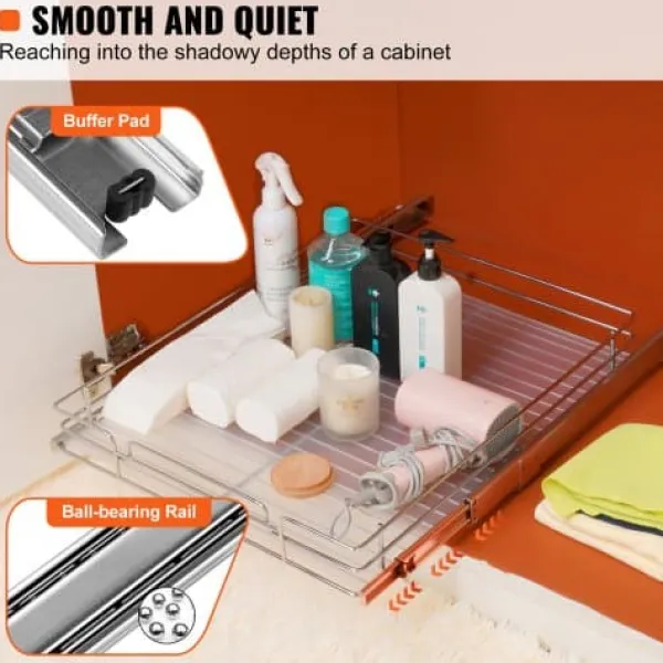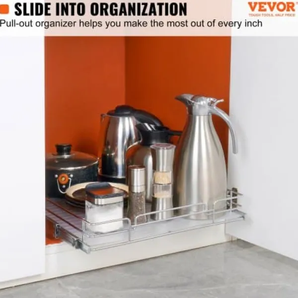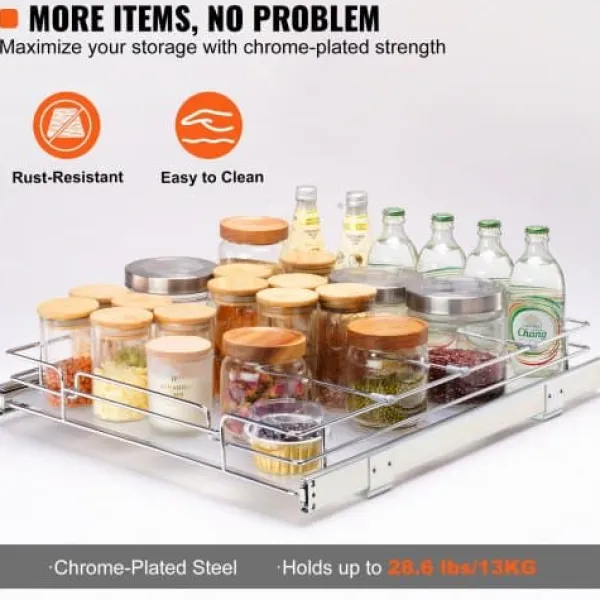 Maksimer dit skabsplads med denne kraftige udtræksorganisator, designet til glidende og lydløs bevægelse selv under tunge belastninger. Den holdbare, forkromede stålkonstruktion sikrer langvarig brug og nem rengøring, hvilket gør den ideel til organisering af gryder, pander, rengøringsmidler og meget mere i dit køkken, badeværelse eller under vasken. Den nemme installation og praktiske design hjælper med at holde dit hjem ryddeligt og frit for rod.