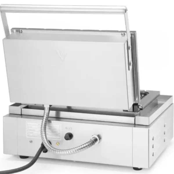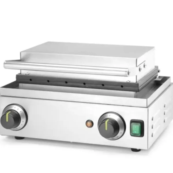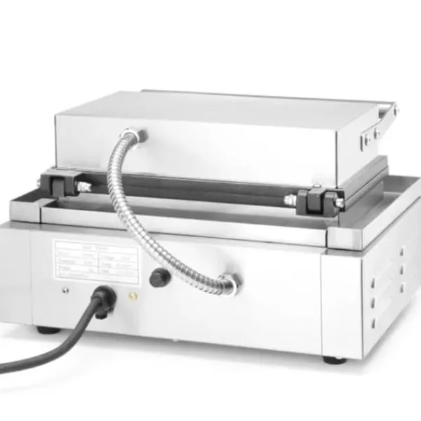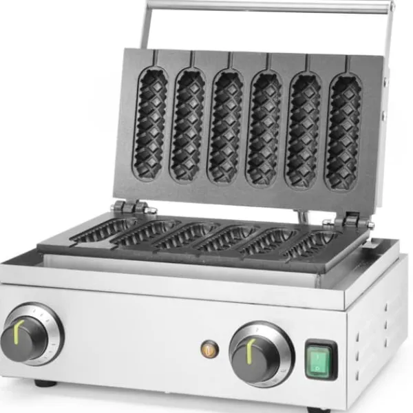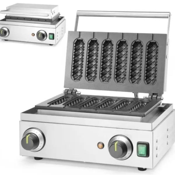 Producentkode: 212189 Hendi Corn-dog vaffelmaskinen er et ideelt tilbud til alle typer cateringvirksomheder, der ønsker at udvide deres tilbud med attraktive vafler på pind. Huset er lavet af 18/0 rustfrit stål, hvilket garanterer langtidsbrug og nem rengøring. Ventilationshuller i huset beskytter betjeningselementerne mod overophedning. Håndtaget varmer ikke op. Varmepladen er lavet af støbt aluminium og beklædt med en slidstærk belægning med en blanding af titanium, som forhindrer klæbning. Mulighed for at bage 6 vafler eller majshunde på samme tid. Brættet har specielle riller til pinde. En drypbakke til overskydende dej gør det nemmere at holde arbejdsstationen ren. Temperaturen justeres trinløst ved hjælp af en termostat i området fra 50˚C til 220˚C. Timeren har en rækkevidde på op til 15 minutter. Produktegenskaber: – Corn-dog vafler på en pind, – Non-stick belægning lavet af aluminium med en blanding af titanium, – Høj effektivitet – 6 vafler på samme tid, – Drip. bakke. Tekniske parametre: – Katalognummer – 212189 – Tilstand – Ny – Materiale – Rustfrit stål 18/0 – Effekt – 1550 W – Spænding – 230 V – Termostat – 50-220˚C – Dimensioner – 390x340x(H)245 mm – Egenvægt – 10 kg Sættet indeholder: – Vaffelmaskine