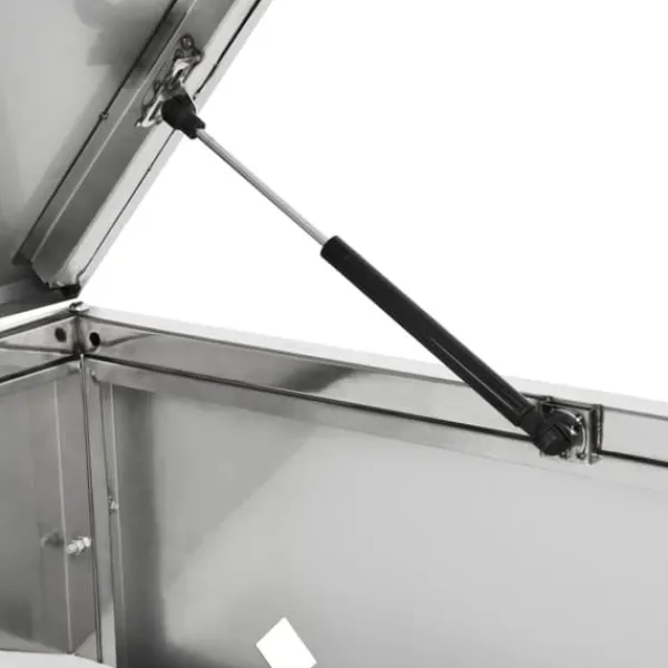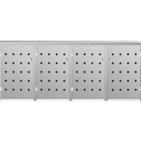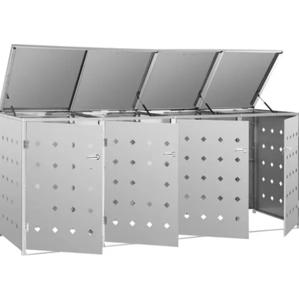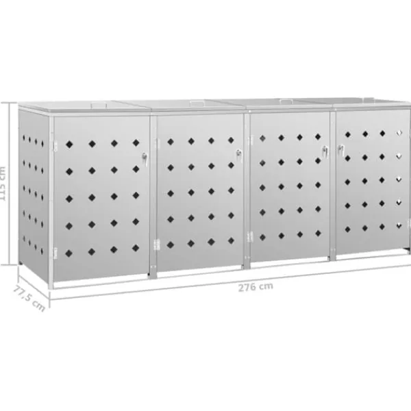 Skraldespandsskjuleren er lavet af rustfrit stål, så den er yderst vejrbestandig og holdbar. De nyttige ventilationshuller tillader luftcirkulation og forhindrer grimme lugte i skraldespandsskjuleren, mens låsesystemet sørger for sikker opbevaring af affald. Den praktiske dør gør det nemt at sætte skraldespanden ind og tage den ud igen.