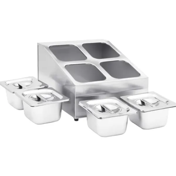 - Inkluderer 4 GN 1/6-pander med matchende låg