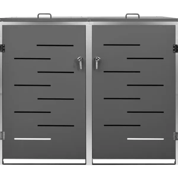 Dette skraldespandsskur er lavet af galvaniserede stålpaneler og et stel i rustfrit stål, hvilket gør det yderst robust og rustbeskyttet. Det hullede design tillader luftcirkulation og forebygger dårlige lugte i skraldespandsskjuleren. Låsesystemet garanterer sikker opbevaring af skraldet. Ydermere gør det praktiske låg og fjedre det nemt at smide skrald ud i skraldespanden og tømme den igen.