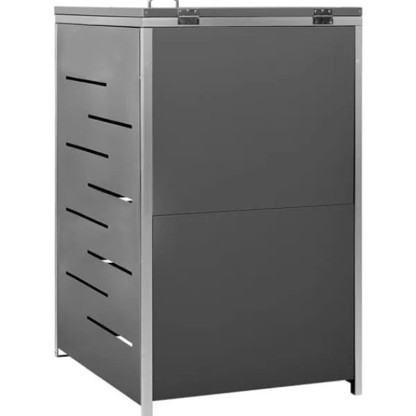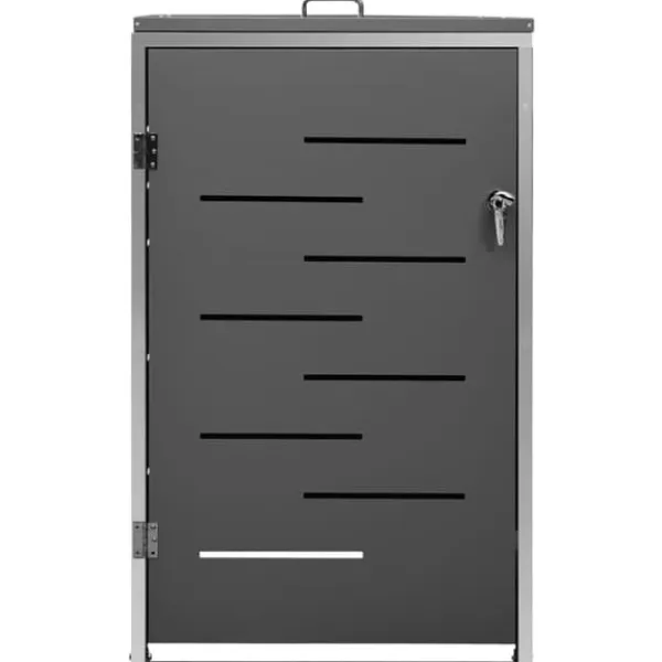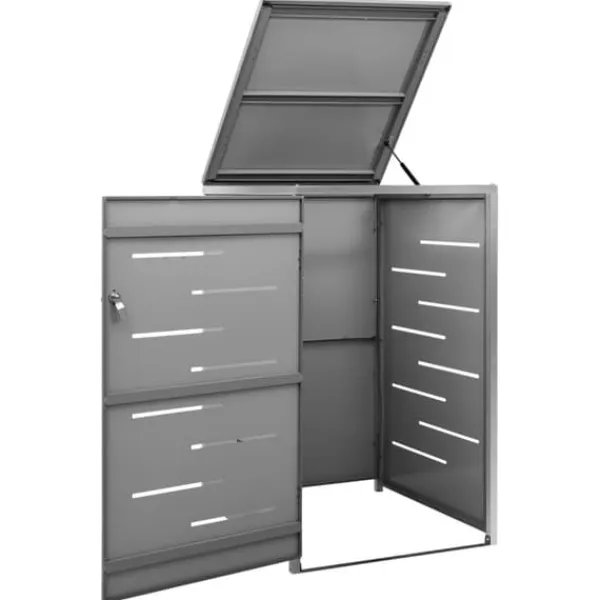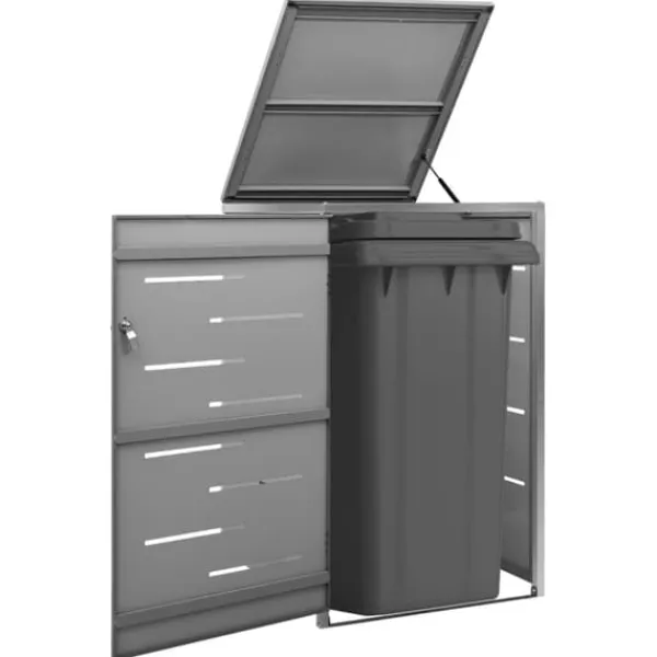 Dette skraldespandsskur er lavet af galvaniserede stålpaneler og et stel i rustfrit stål, hvilket gør det yderst robust og rustbeskyttet. Det hullede design tillader luftcirkulation og forebygger dårlige lugte i skraldespandsskjuleren. Låsesystemet garanterer sikker opbevaring af skraldet. Ydermere gør det praktiske låg og fjedre det nemt at smide skrald ud i skraldespanden og tømme den igen.