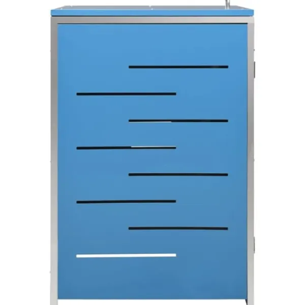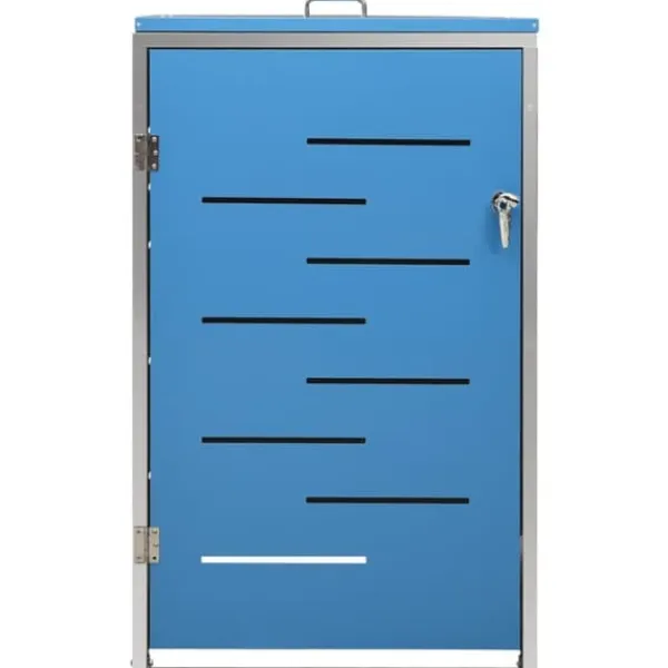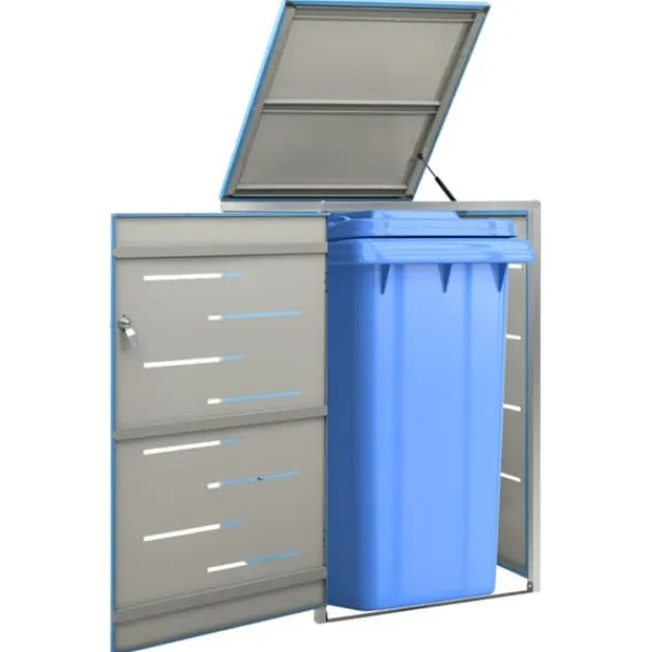 Dette skraldespandsskur er lavet af galvaniserede stålpaneler og et stel i rustfrit stål, hvilket gør det yderst robust og rustbeskyttet. Det hullede design tillader luftcirkulation og forebygger dårlige lugte i skraldespandsskjuleren. Låsesystemet garanterer sikker opbevaring af skraldet. Ydermere gør det praktiske låg og fjedre det nemt at smide skrald ud i skraldespanden og tømme den igen.