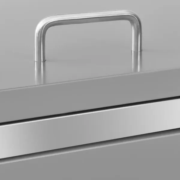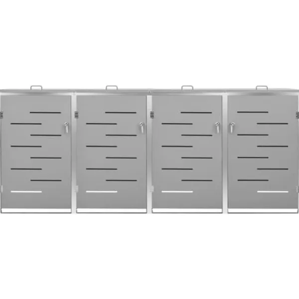 Dette skraldespandsskur er lavet af galvaniserede stålpaneler og et stel i rustfrit stål, hvilket gør det yderst robust og rustbeskyttet. Det hullede design tillader luftcirkulation og forebygger dårlige lugte i skraldespandsskjuleren. Låsesystemet garanterer sikker opbevaring af skraldet. Ydermere gør det praktiske låg og fjedre det nemt at smide skrald ud i skraldespanden og tømme den igen.