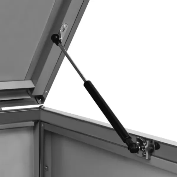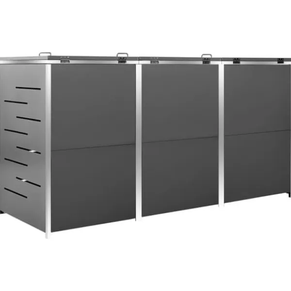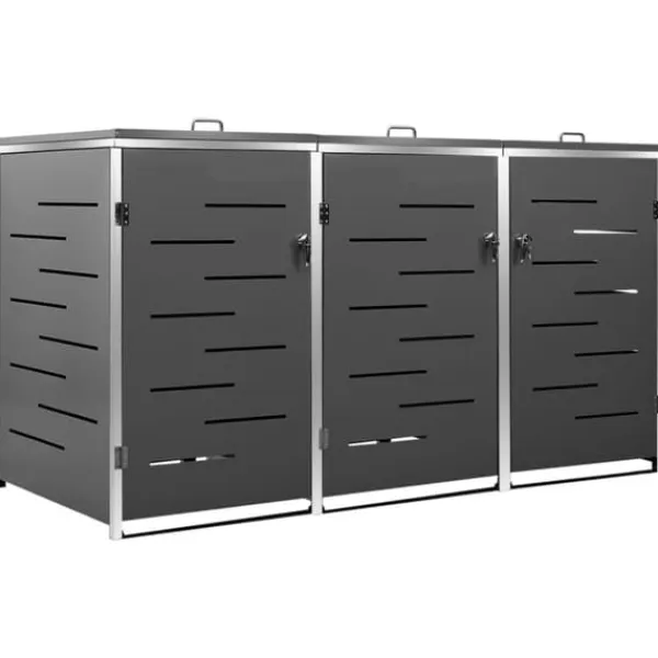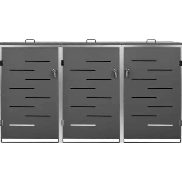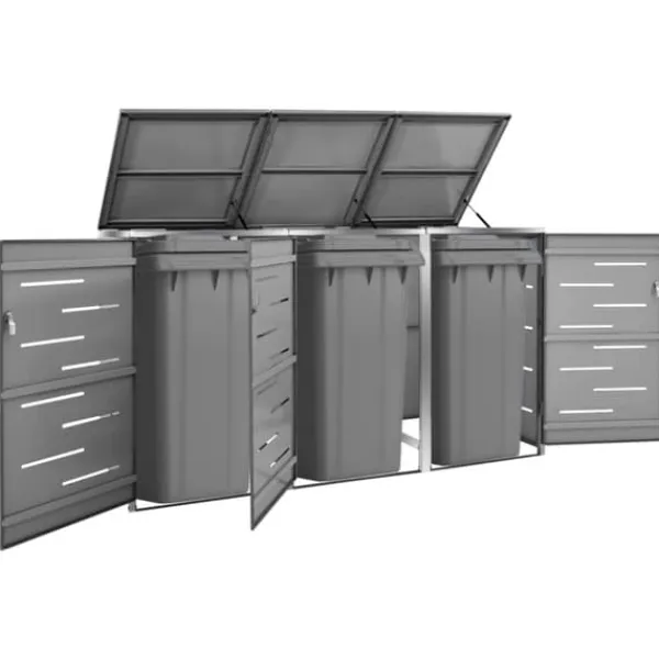 Dette skraldespandsskur er lavet af galvaniserede stålpaneler og et stel i rustfrit stål, hvilket gør det yderst robust og rustbeskyttet. Det hullede design tillader luftcirkulation og forebygger dårlige lugte i skraldespandsskjuleren. Låsesystemet garanterer sikker opbevaring af skraldet. Ydermere gør det praktiske låg og fjedre det nemt at smide skrald ud i skraldespanden og tømme den igen.