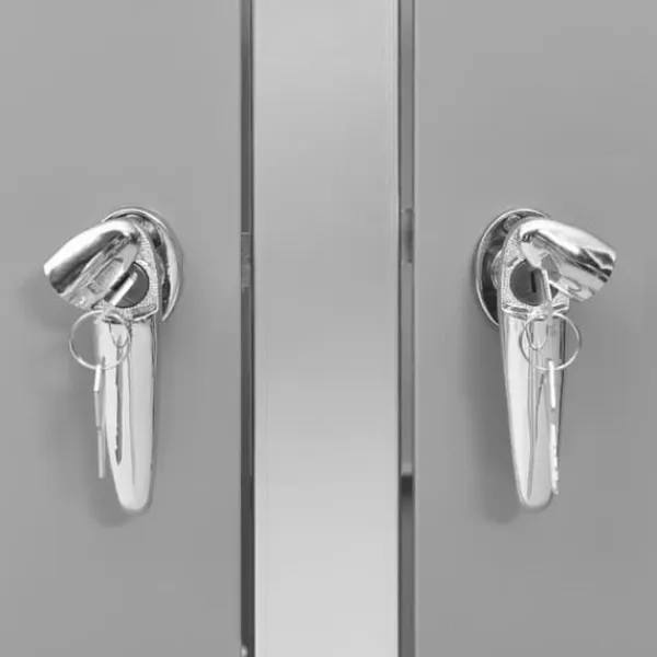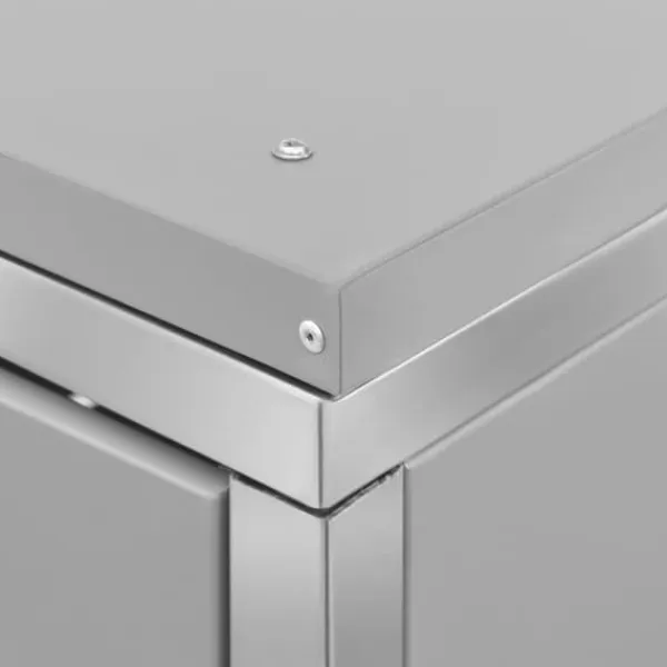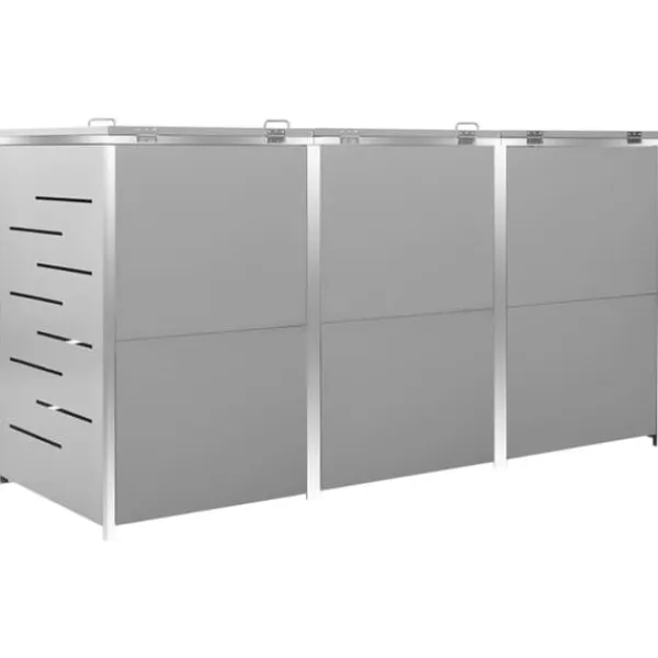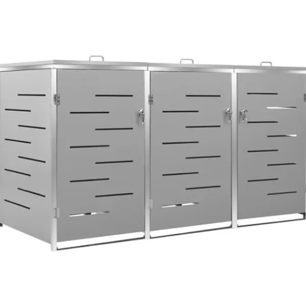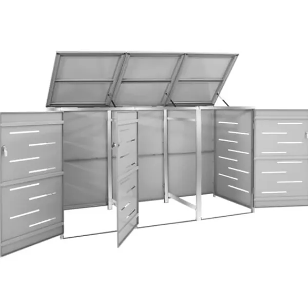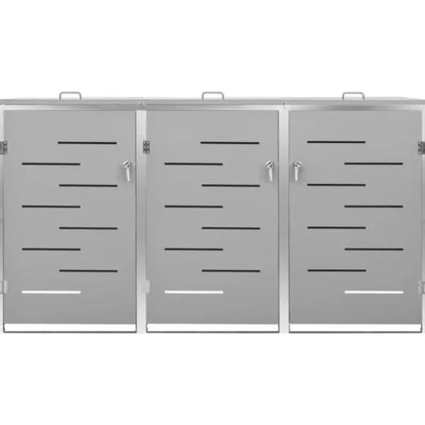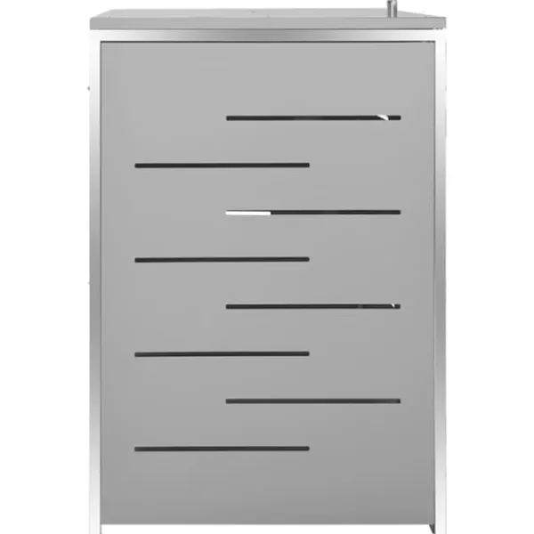 Dette skraldespandsskur er lavet af galvaniserede stålpaneler og et stel i rustfrit stål, hvilket gør det yderst robust og rustbeskyttet. Det hullede design tillader luftcirkulation og forebygger dårlige lugte i skraldespandsskjuleren. Låsesystemet garanterer sikker opbevaring af skraldet. Ydermere gør det praktiske låg og fjedre det nemt at smide skrald ud i skraldespanden og tømme den igen.