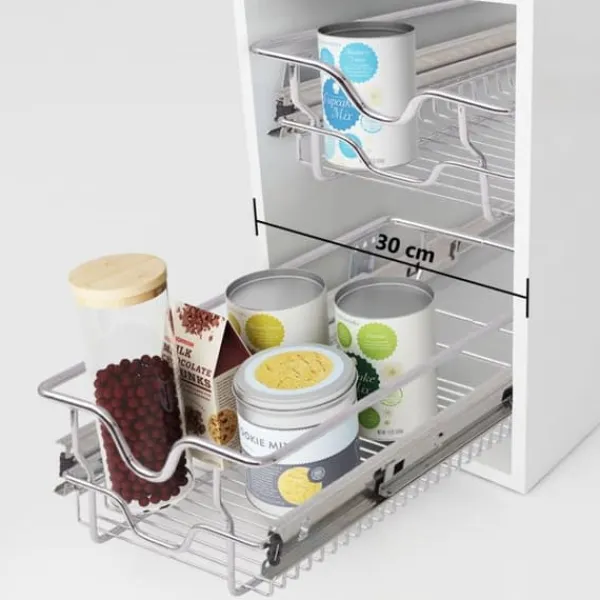 Takket være de fuldt udtrækkelige løberuller med kuglelejer kan disse trådkurve nemt åbnes og lukkes. De er egnet til 30 cm brede skabe og har en maksimal belastningsevne på 25 kg hver.