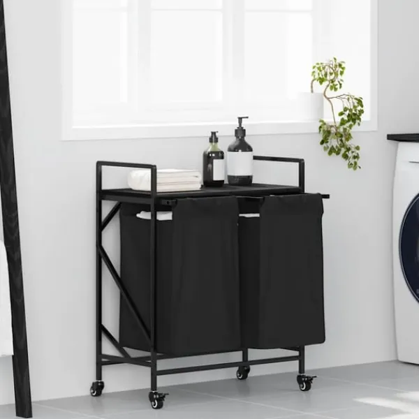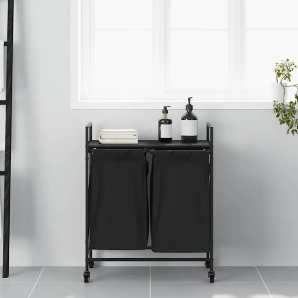 Vasketøjskurven er en rummelig og praktisk opbevaringsløsning med udtræksposer og hjul, der gør det nemt at organisere og transportere vasketøjet.