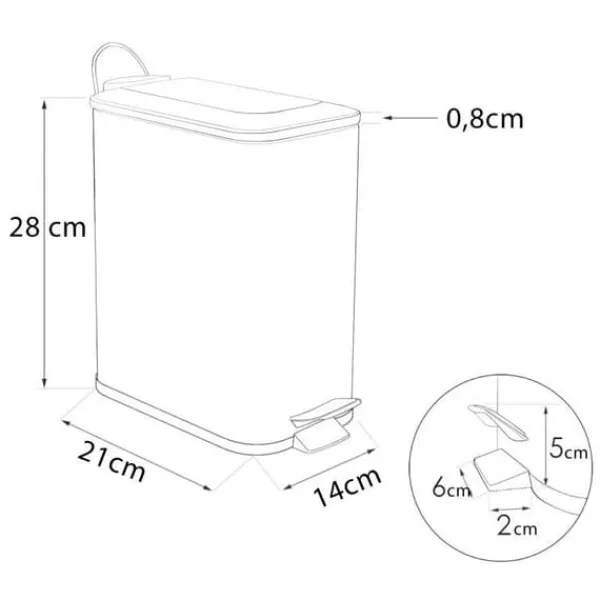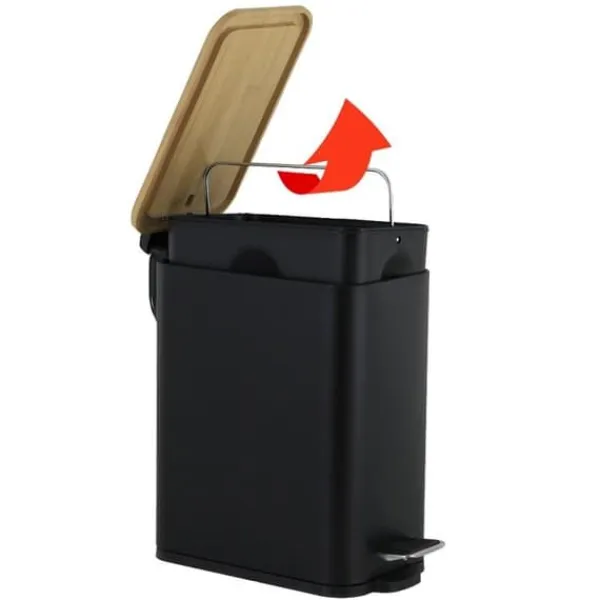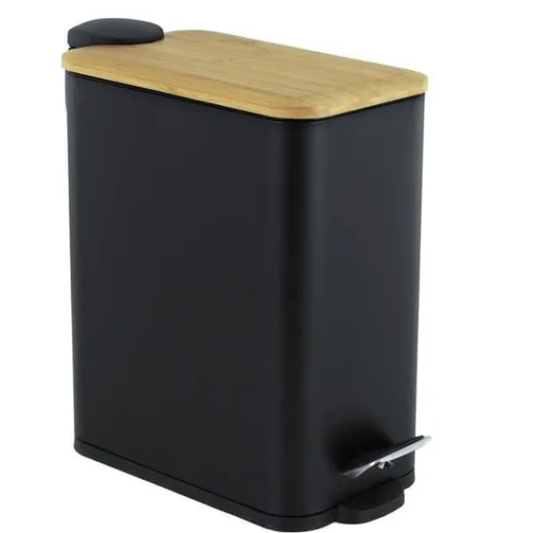 Denne moderne papirkurv er velegnet til badeværelset og er lavet af pulverlakeret stål og naturligt bambustræ. Den sorte pedalspand har en flot mat finish. Låget er lavet af bambustræ og giver helheden et unikt udtryk. Takket være den praktiske pedal kan du åbne låget uden at bruge dine hænder. Affaldsbeholderen indeholder en sort spand med et praktisk håndtag, der gør det nemmere at tømme kurven. Hele produktets bund er lavet af plast, som ikke ridser gulvoverfladen på badeværelset eller toilettet. På bagsiden af pedalspanden er der et ekstra metalhåndtag til at bære eller hænge spanden. Skraldespandens kapacitet er 5 liter.