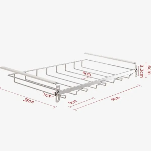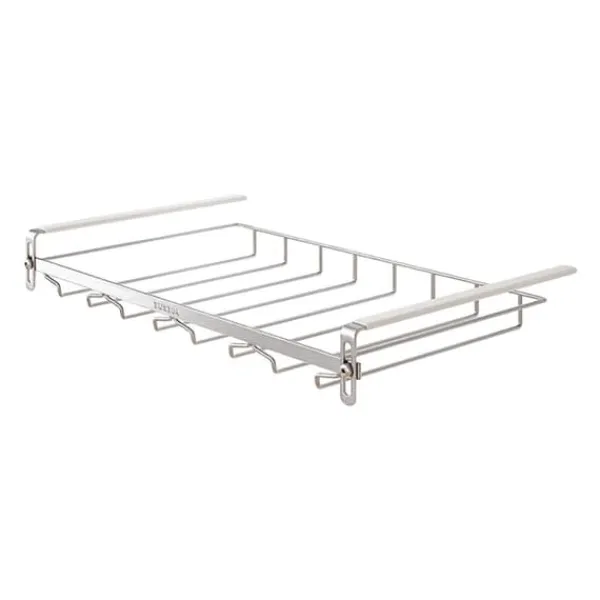 Denne praktiske glasholder er en elegant og pladsbesparende løsning til opbevaring af vinglas og andre glas med fod. Ved at hænge glassene under en hylde frigøres plads på køkkenbordet og i skabet, samtidig med at glassene er let tilgængelige og beskyttede.