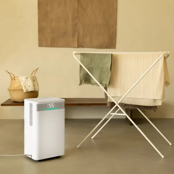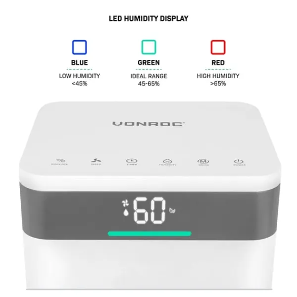 - Smart LED-display: Viser luftfugtighed i realtid med farvekoder (blå, grøn, rød)