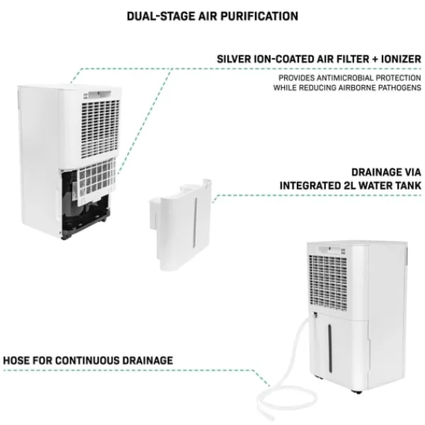 Med en affugtningskapacitet på op til 12 liter pr. dag og et lydniveau på kun ≤ 38 dB, er den ideel til soveværelser, stuer, badeværelser og vaskerum. Den indbyggede 2L vandtank slukker automatisk, når den er fuld – eller brug den medfølgende slange til kontinuerlig dræning.