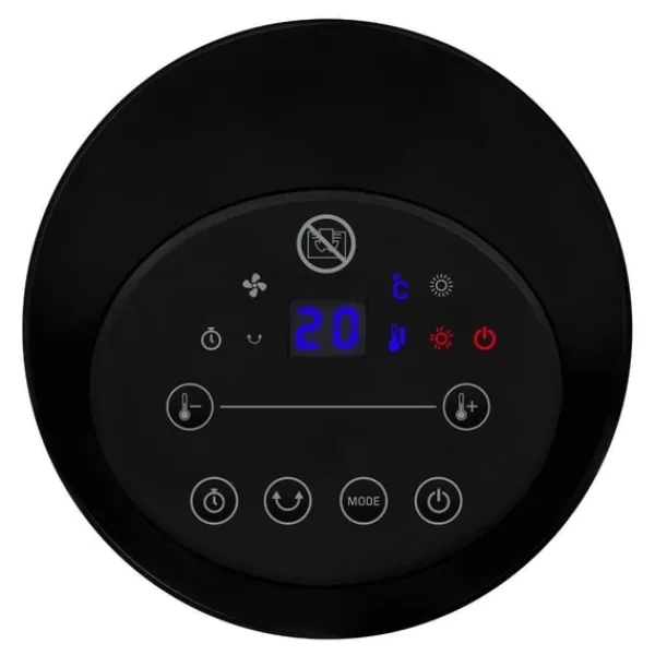 På toppen finder du et moderne touch-betjeningspanel med LED-display, hvor du nemt kan indstille temperatur, aktivere svingfunktion og sætte timeren (1–9 timer). Den medfølgende fjernbetjening gør det ekstra nemt at styre varmen fra sofaen eller skrivebordet.